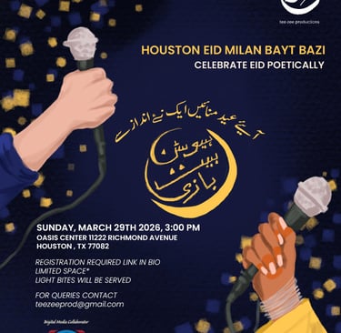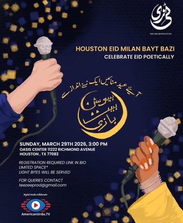 Bayt Bazi is a participatory poetic tradition in which performers respond to one another through verse, drawing from classical and contemporary Urdu poetry. Presented by TeeZee Productions as a live communal performance, Bayt Bazi brings together language, memory, music, and audience engagement—creating an experience that is both culturally grounded and welcoming to newcomers.