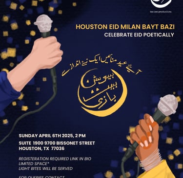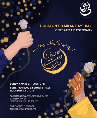 Bayt Bazi is a participatory poetic tradition in which performers respond to one another through verse, drawing from classical and contemporary Urdu poetry. Presented by TeeZee Productions as a live communal performance, Bayt Bazi brings together language, memory, music, and audience engagement—creating an experience that is both culturally grounded and welcoming to newcomers.